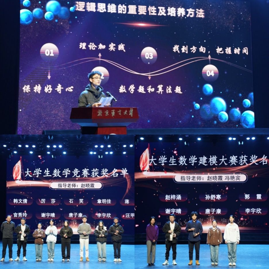 在数学类竞赛展示板块,现场通过视频呈现相关赛事概况和参赛要求。学院党委副书记于东、研究生院副院长刘洁分别为数学竞赛、数学建模竞赛获奖者颁发荣誉证书,获奖学生蒋帅结合参赛经历,分享逻辑思维训练在专业学习中的实践路径与宝贵经验。