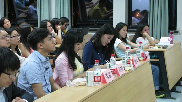在讲座开始前,主持人先对各位嘉宾进行简单的介绍并表示热烈欢迎。接着,鞠萍、陈申、谭震、刘畅分别对“考研”、“就业”、“创业”以及“实习”进行讲解。