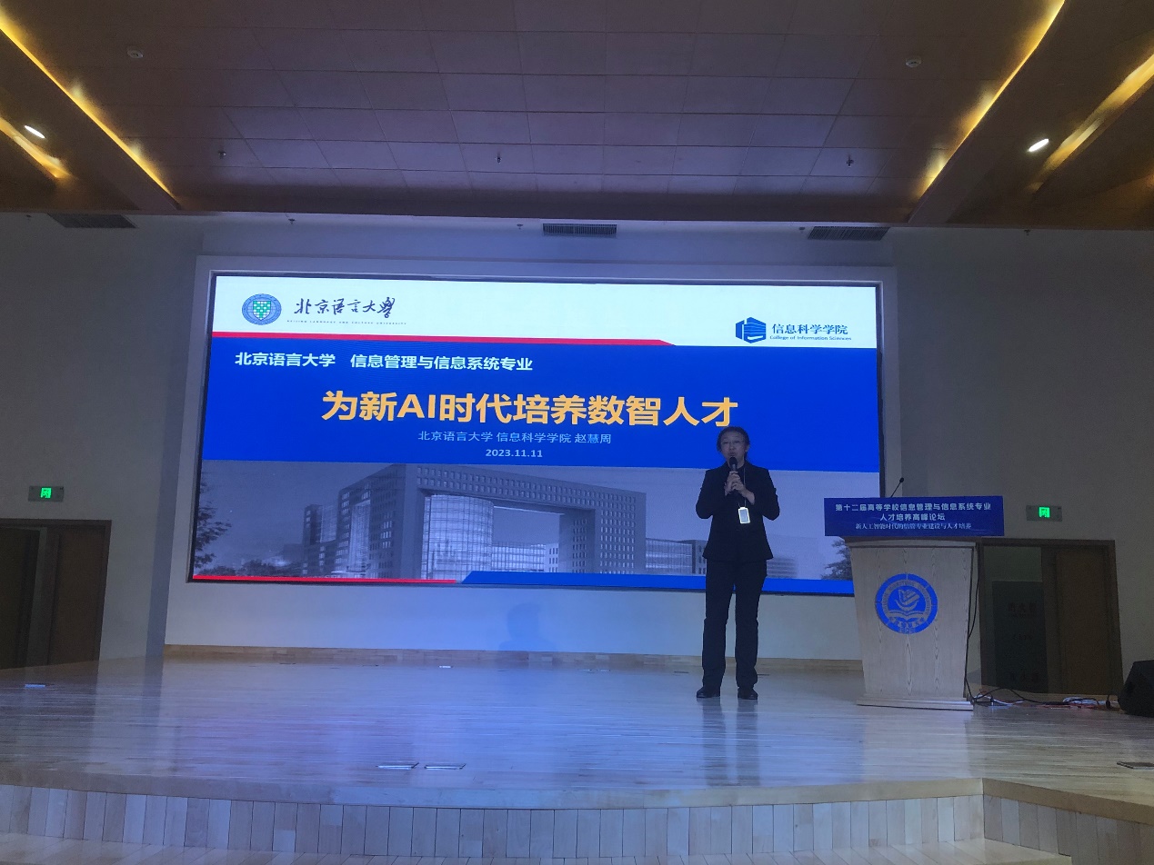 2023年11月11日,“第十二届高等学校信息管理与信息系统专业人才培养高峰论坛”在大连召开,来自高校和企业的100多位代表参加了本届论坛。受教育部信息管理与信息系统专业虚拟教研室邀请,信科院赵慧周老师在论坛上做题为“为新AI时代培养数智人才”的报告,分享我校信管专业建设经验。