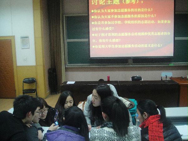 2013年12月15日晚7:00,信息科学学院2013年入党积极分子和本科新生党员分组自由讨论活动——“青春梦有约,志愿爱无疆”讨论会在主南102展开。本次活动由信息科学学院党支部举办,就我校志愿者服务工作进行了全面的介绍,同时引领着大家对志愿服务工作进行了深入的探讨。