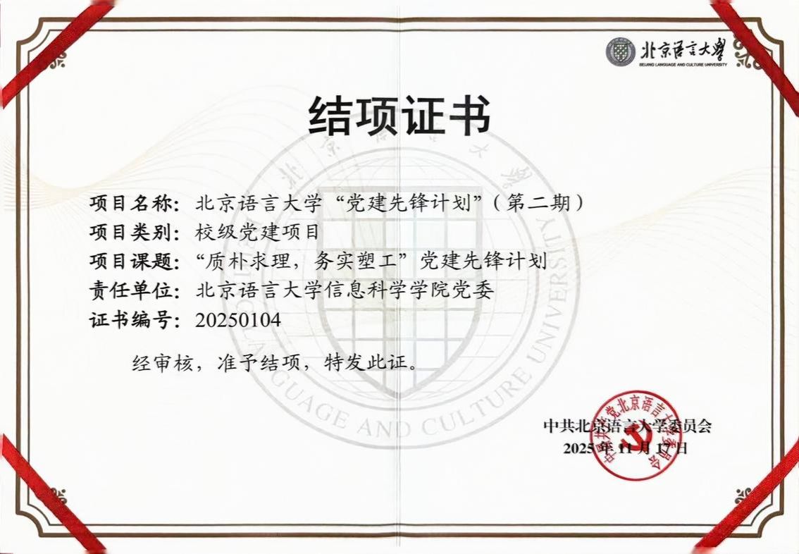2025年11月,学院党委申报的校级党建项目——“质朴求理,务实塑工”党建先锋计划(第二期)顺利结项。研究生一支部书记王雯荣获北京语言大学“青年五四奖章”,成为学院落实立德树人根本任务、培养兼具扎实学识与理想信念的时代新青年的生动典范。2025年12月,研究生第一党支部创新实施“IORP”(思想、组织、科研、实践)四维共振工作法,将党支部建在科研团队上,打造“党建阵地+科研现场”深度融合模式,该部在继2024年成功获批“北京高校党建工作样板支部”培育创建单位后,被学校推荐为第四批全国高校“百个研究生样板党支部”候选支部。