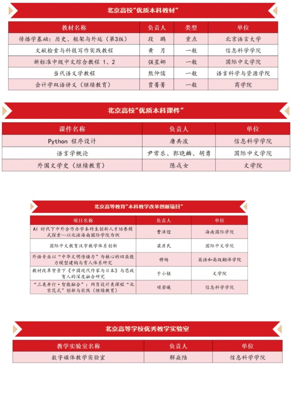 近日,北京市教育委员会公布2025年北京高校本科教学项目建设获评结果,我校共计28项教学项目成功入选。信息科学学院解焱陆、黄月、项若曦、唐共波四位教师分别凭借优秀教学项目成果荣誉登榜,充分展现了学院教师队伍扎实过硬的专业素养。