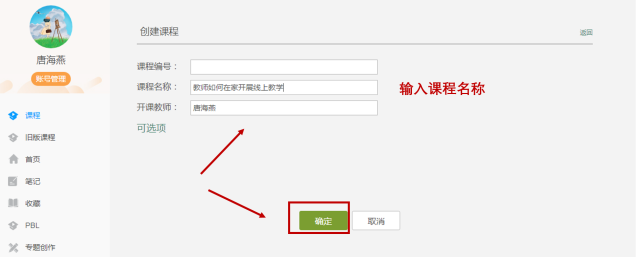 登录后,在页面右上角点击“创建课程”,在弹出的对话框输入课程名称,点击确定。