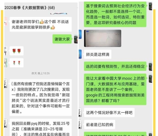 同学们学习热情似火,本来九点半就下课的,讨论到十点过,我说都说了再见晚安了,还有学生意犹未尽在问,于是又聊了一会儿,最后又说晚安,已经十点四十了。刚开始我们其实聊的是大数据在营销上的应用,后来把数据和肺炎这个热点结合起来看,大家瞬间兴趣起来了,好奇心来了,开始自己在百度指数上看数据。我感觉通识课的学生积极性都很高,也有可能是新冠肺炎关注度高,和大家都感兴趣的点关联起来,学生们的积极性就很高了。