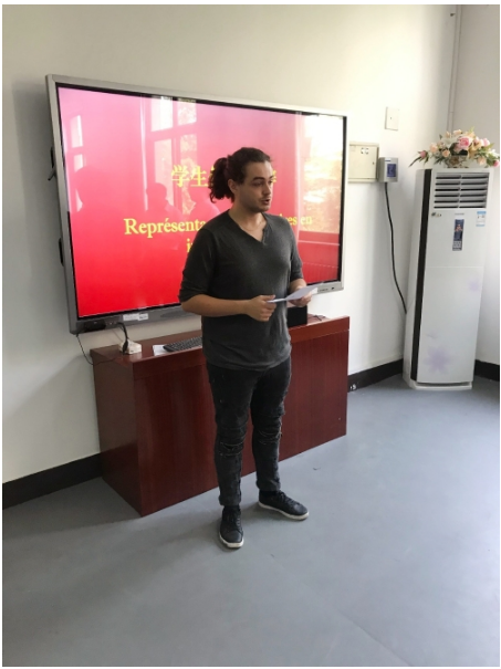 Mathias Wilmotte同学作为学生代表,用刚刚学习了一个月的汉语做了致谢发言,博得在场的每一位同学和老师的赞扬。Mathias Wilmotte同学致谢发言中提到,在北语信息科学学院的64天实习时间很短,但给他留下了深刻的印象,特别感谢李超书记、刘颖滨老师,通过他们,对中国、对中国文化有了更深一步的了解,今后,希望再来中国,用自己的专业知识做一名合格的中法文化交流使者。
