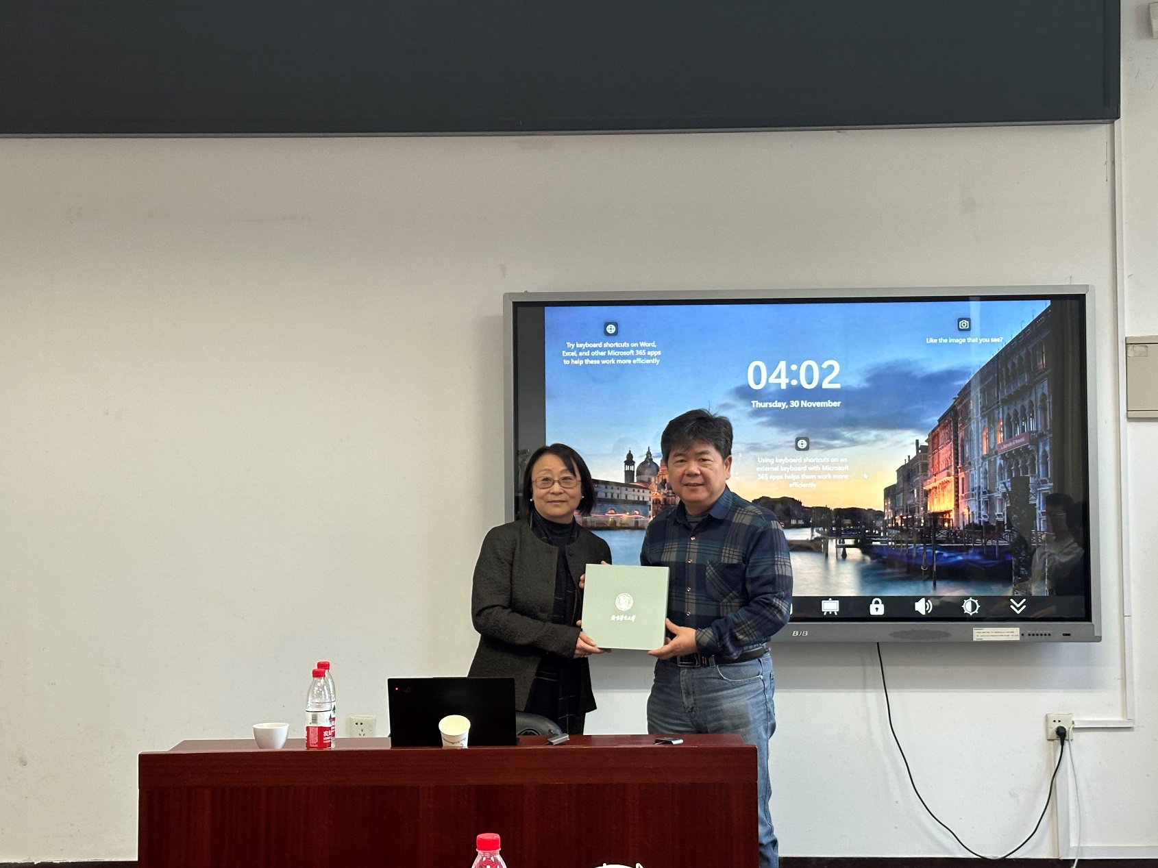 张劲松教授代表北京语言大学归国留学人员联谊会向陈轶亚教授赠送学校纪念品。
